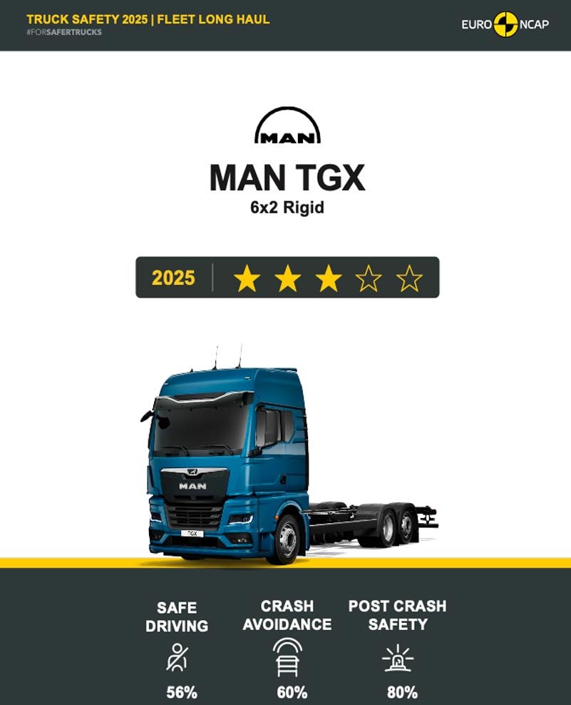 Donde realmente brilla el TGX es en la carretera. Euro NCAP destaca su sistema de mantenimiento de carril de “alto rendimiento”, que controla la trayectoria de forma suave y sin molestar al conductor. Sus sistemas de prevención de colisiones frontales son buenos, con una frenada de emergencia (AEB) eficaz ante vehículos, peatones y ciclistas. Además, incluye una innovadora función de “parada segura” que detiene el vehículo si el conductor no responde.